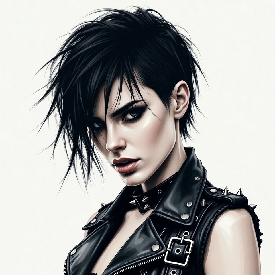 White, black hair, choker, digital art, edgy style, female, illustration, intense gaze, leather vest, makeup, pixie cut, portrait, punk fashion, spikes, studs, woman