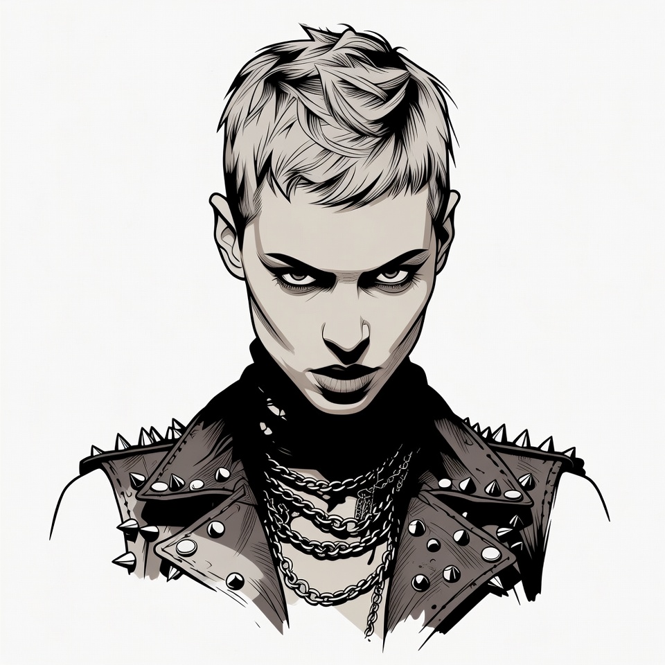 White, blonde hair, chains, edgy fashion, female, grayscale, illustration, intense eyes, leather vest, line art, necklace, portrait, punk style, short hair, spiked vest, woman
