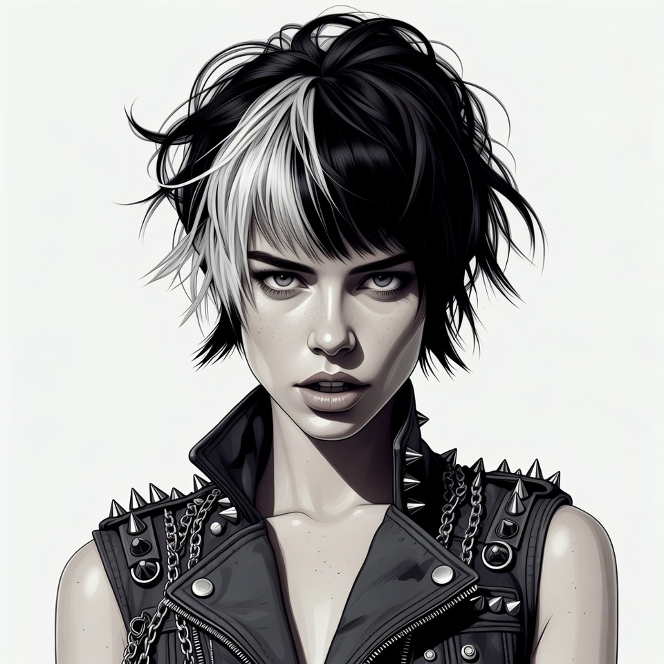 black white hair, chains, collar, digital art, edgy fashion, female, illustration, intense gaze, isolated background, leather vest, portrait, punk hairstyle, short hair, spikes, split hair, studs, tousled hair, vest, white background, woman