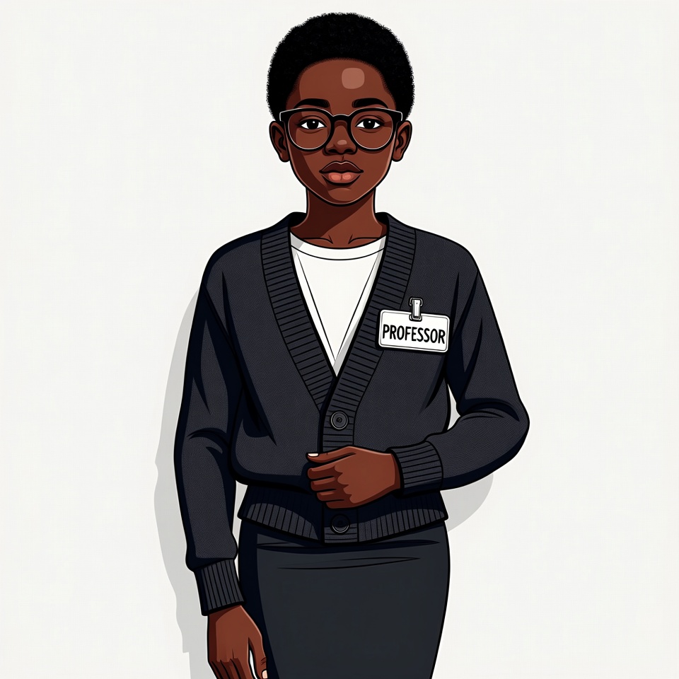 A cartoon illustration of a young African-American girl dressed as a professor stands against a white background. She has short curly black hair, wears round glasses, a white shirt, dark cardigan with a 'Professor' name badge, and a matching skirt. Her hands are clasped in front as she poses confidently.