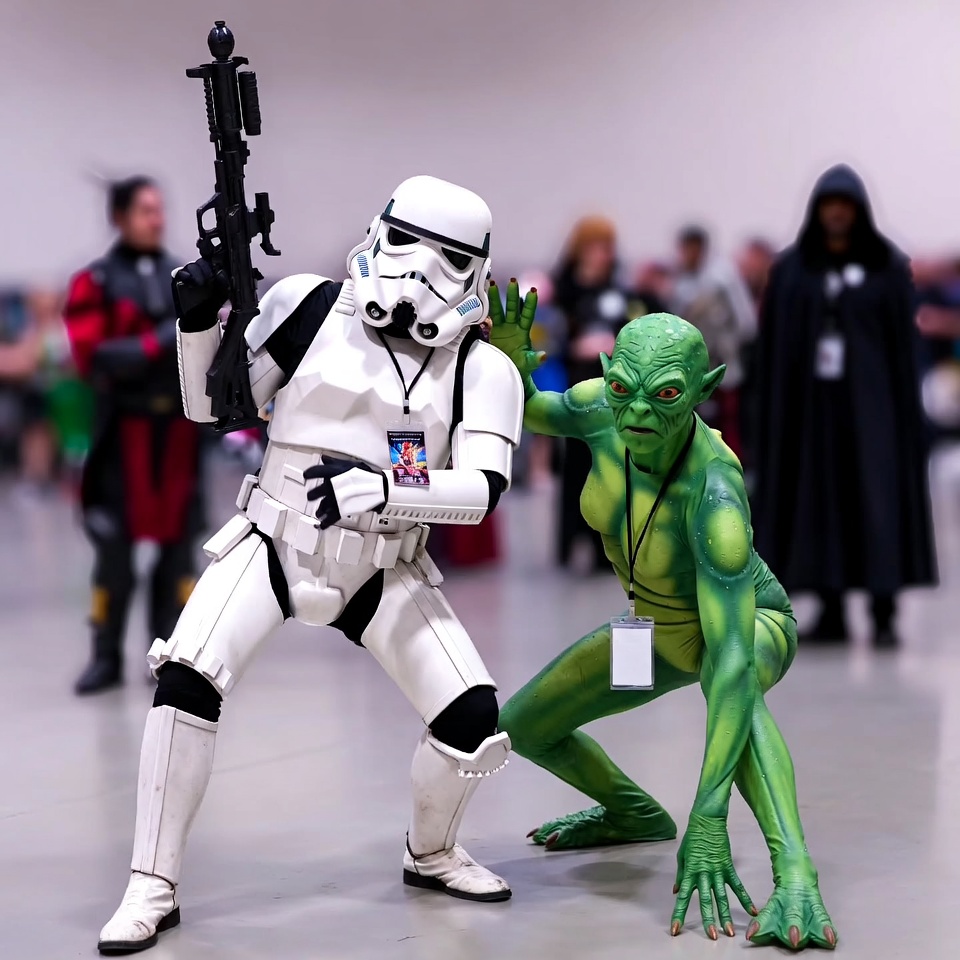 A person in a full white Stormtrooper costume holds a blaster rifle and poses dynamically next to a woman in a detailed green alien costume with reptilian features and claws. They stand on a convention floor with blurred cosplayers and booths in the background. Both wear name badges hanging from their outfits.