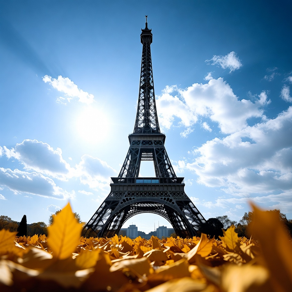 The Eiffel Tower stands tall against a bright blue sky with scattered white clouds and sunlight rays. In the foreground, a ground covered in vibrant yellow and orange autumn leaves leads up to the base of the tower. Paris buildings are visible through the tower's arches in the background.