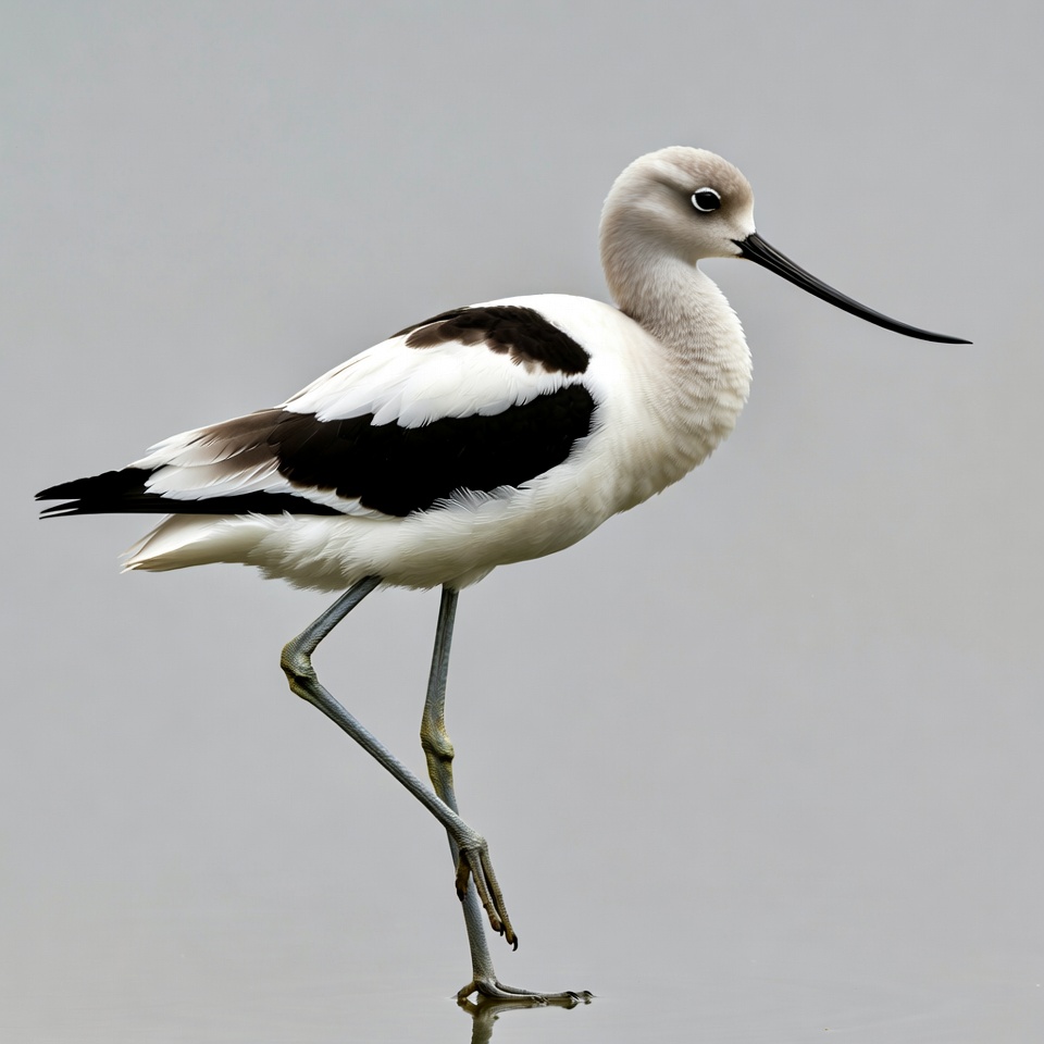 beak, bird, black white bird, feathers, gray background, isolated, long bill, long legs, nature, one leg, plumage, shorebird, standing, stilt bird, wading bird, water bird, wildlife, Black-winged Stilt
