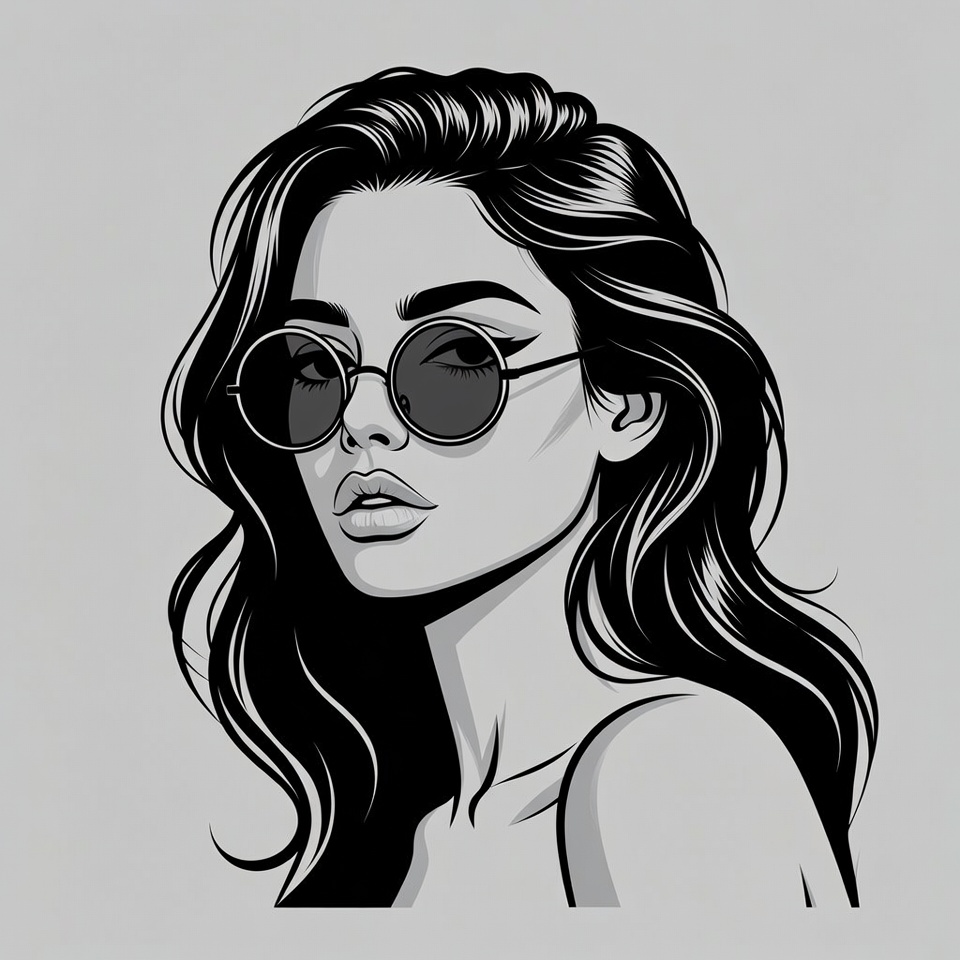 A stylized black and white illustration of a woman with long wavy black hair wearing large round sunglasses. She has a subtle side profile with full lips and defined facial features. The image is rendered in a graphic art style on a gray background.