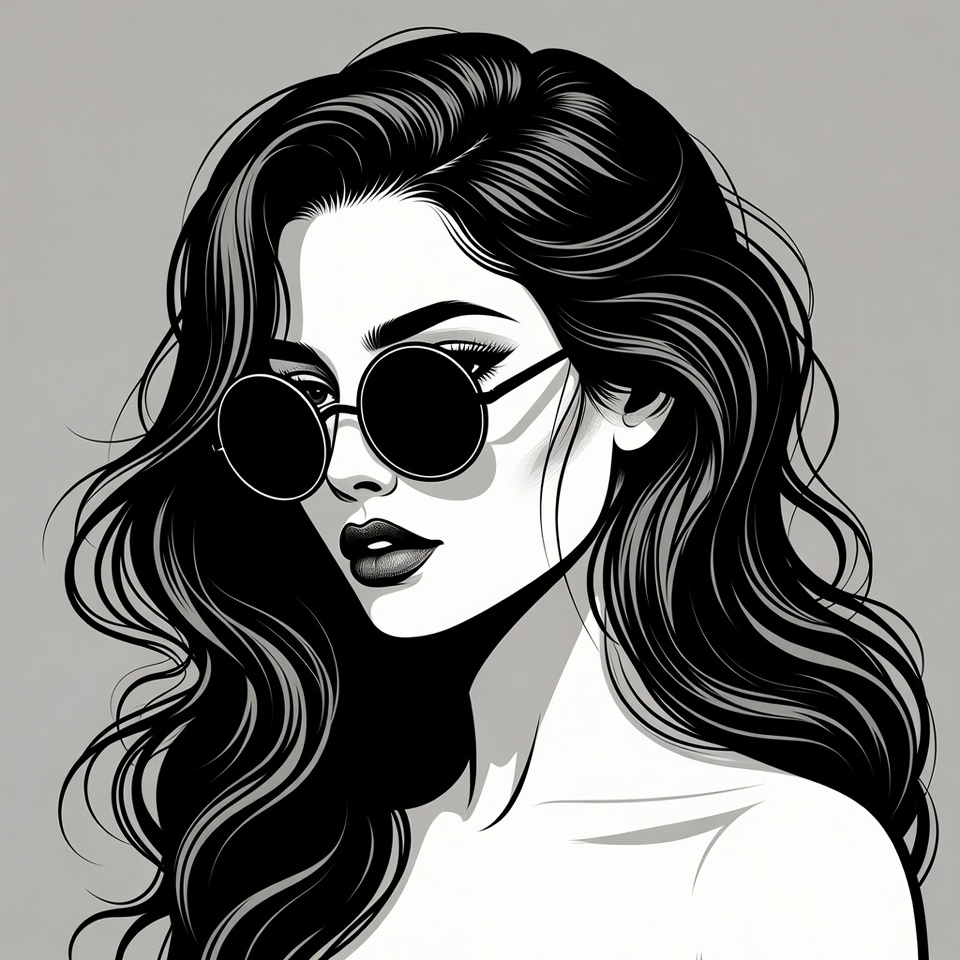 Black and white line art illustration of a woman with long wavy black hair turned slightly to the side. She wears large round sunglasses, has full lips, and a bare shoulder visible. The portrait is set against a plain gray background.