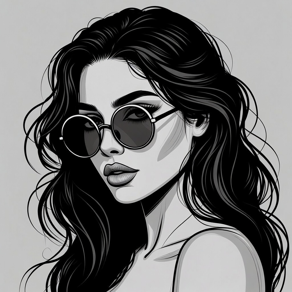 A black and white illustration depicts a young woman with long wavy black hair and full lips. She wears large round sunglasses and gazes sideways with a subtle expression. The artwork features bold line art on an isolated gray background.