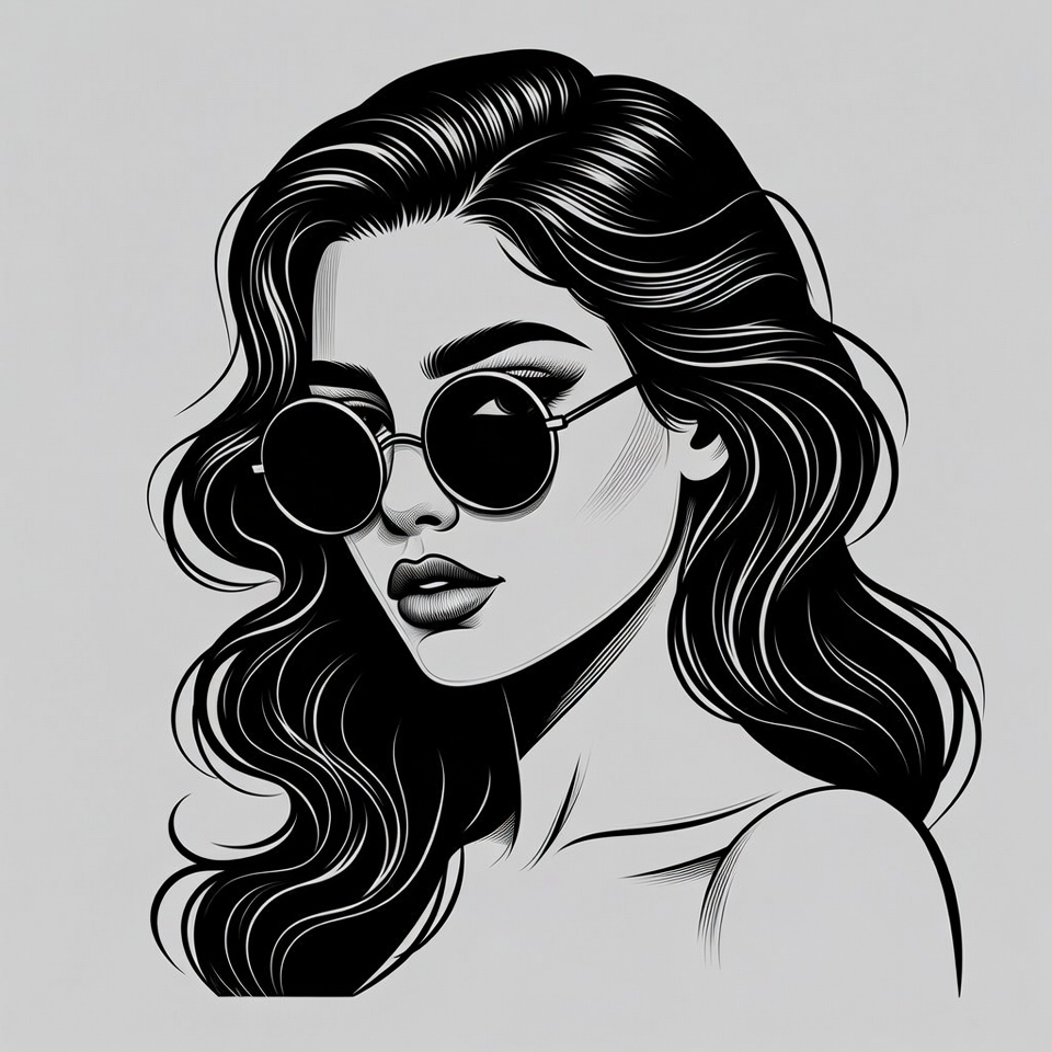 artistic, beauty, black and white, black hair, drawing, edgy style, face, female, female portrait, illustration, ink drawing, line art, lips, long hair, portrait, profile view, round sunglasses, stylish, sunglasses, vector art, wavy hair, woman