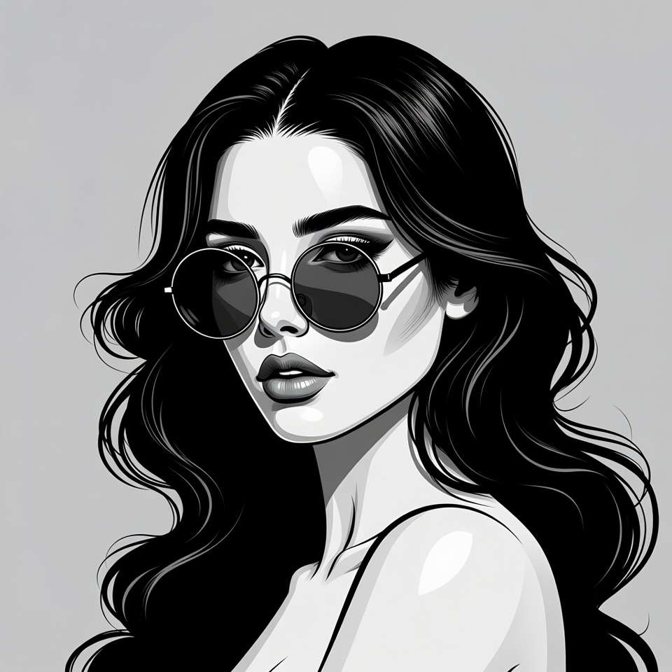 A digital line art illustration of a young woman with long wavy black hair and full lips. She wears large round sunglasses and a sleeveless top, gazing slightly to the side. The image is rendered in black and white on a gray background.