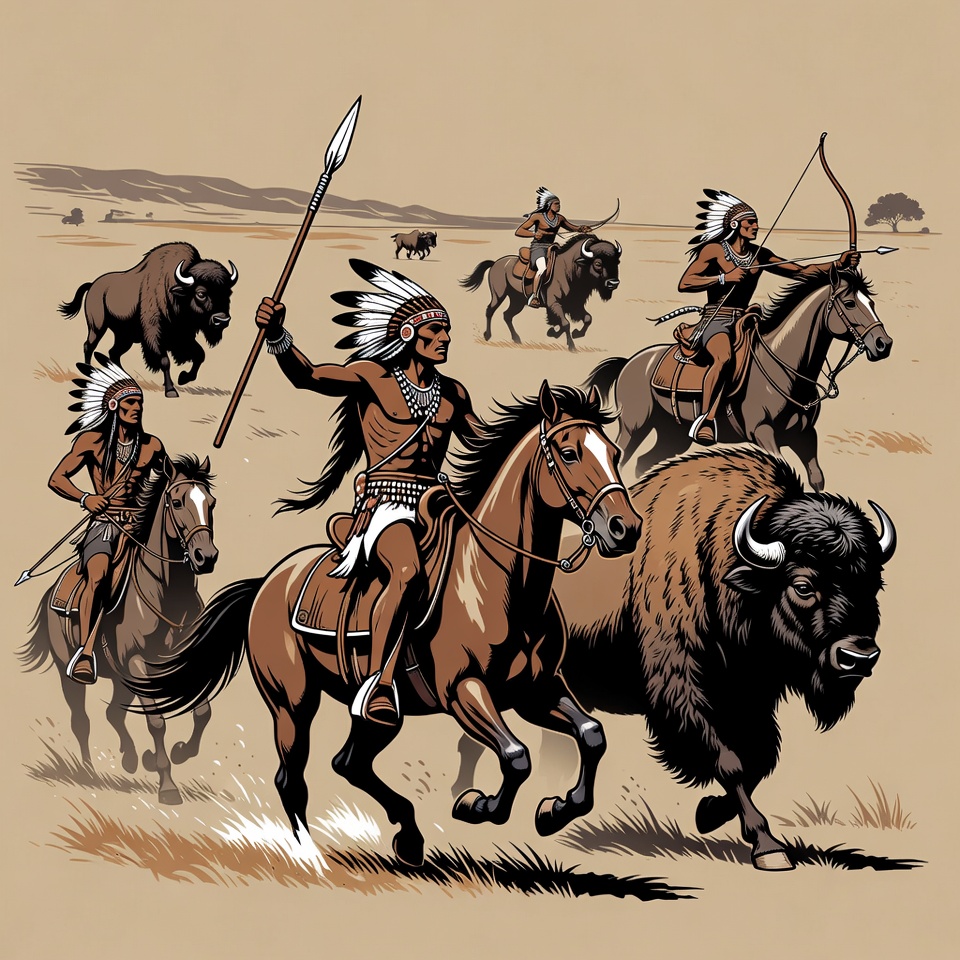 Several Native American men in traditional feathered headdresses ride horses while hunting a herd of buffalo on a grassy plain. They wield spears and bows aimed at the charging bison. The illustration features dynamic action poses against a simple beige background.