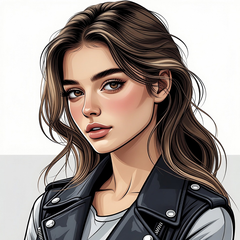 A young woman with long wavy brown hair and striking makeup gazes forward. She wears a black leather jacket over a white top, with subtle blush on her cheeks and glossy lips. The digital illustration features her on a plain background.