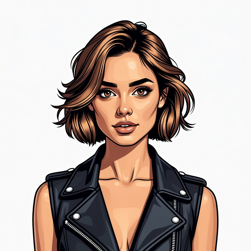 beautiful woman, black leather, brown hair, confident expression, digital art, edgy look, fashion illustration, female, illustration, isolated background, leather vest, makeup, portrait, short hair, striking eyes, stylish woman, wavy hair, white background, woman