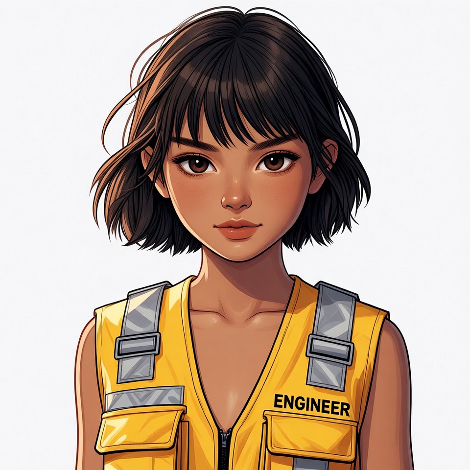 An illustration of a young Asian woman with shoulder-length dark brown hair and bangs wears a bright yellow safety vest labeled 'ENGINEER'. She has expressive brown eyes, full lips, and a neutral expression, facing forward. The vest features reflective strips and pockets, set against a white isolated background.
