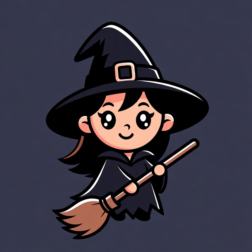 A chibi-style cartoon girl dressed as a witch wears a tall black pointed hat and flowing black robe. She holds a wooden broomstick in her hands and smiles with large sparkling eyes. The illustration features bold outlines and is set against a dark solid background.