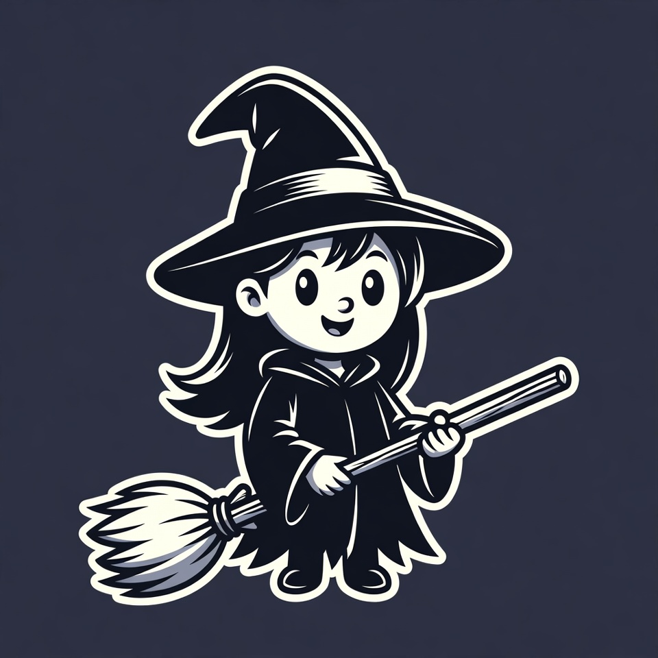 A cute cartoon girl dressed as a witch wears a black pointed hat and robe. She holds a broomstick in her hands and smiles happily. The illustration features bold black outlines on a dark blue background.