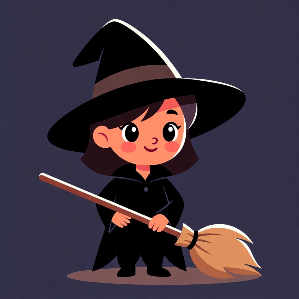 A cute cartoon girl with short brown hair wears a black witch hat and robe. She holds a broomstick with both hands and stands on a dark purple background. Her large expressive eyes and smiling face give her a cheerful appearance.