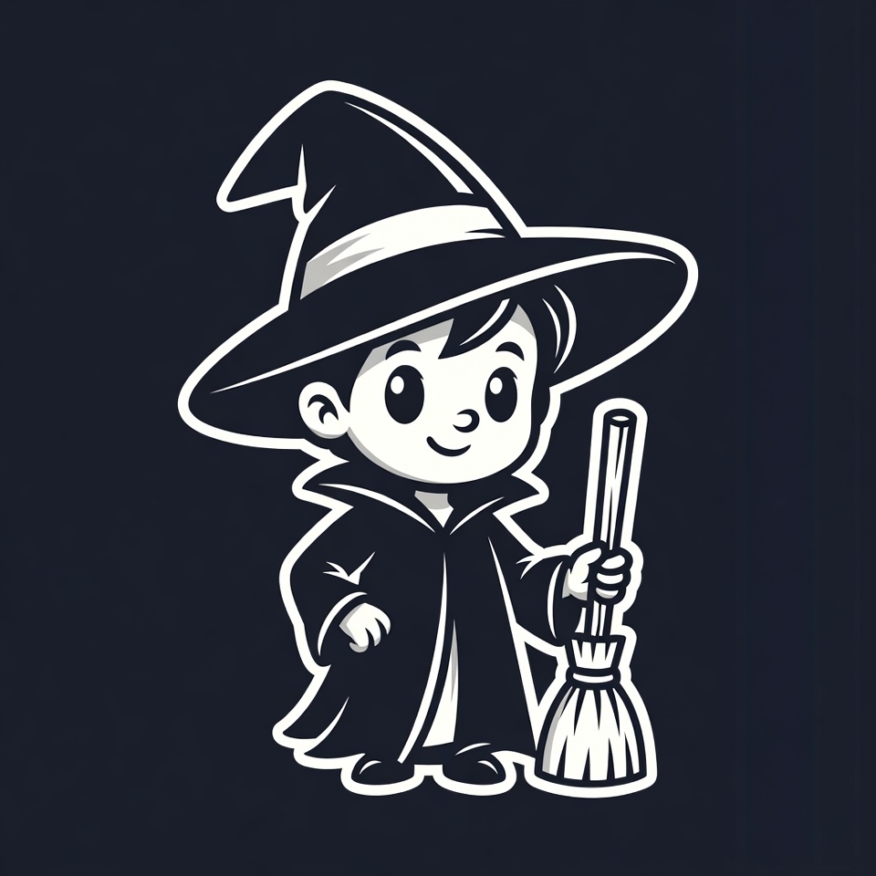 black and white, broom, broomstick, cape, cartoon, chibi, clipart, costume, cute, dark background, flowing cape, halloween, hat, illustration, isolated background, kawaii, line art, magic, pointed hat, smiling boy, wizard, young boy, boy