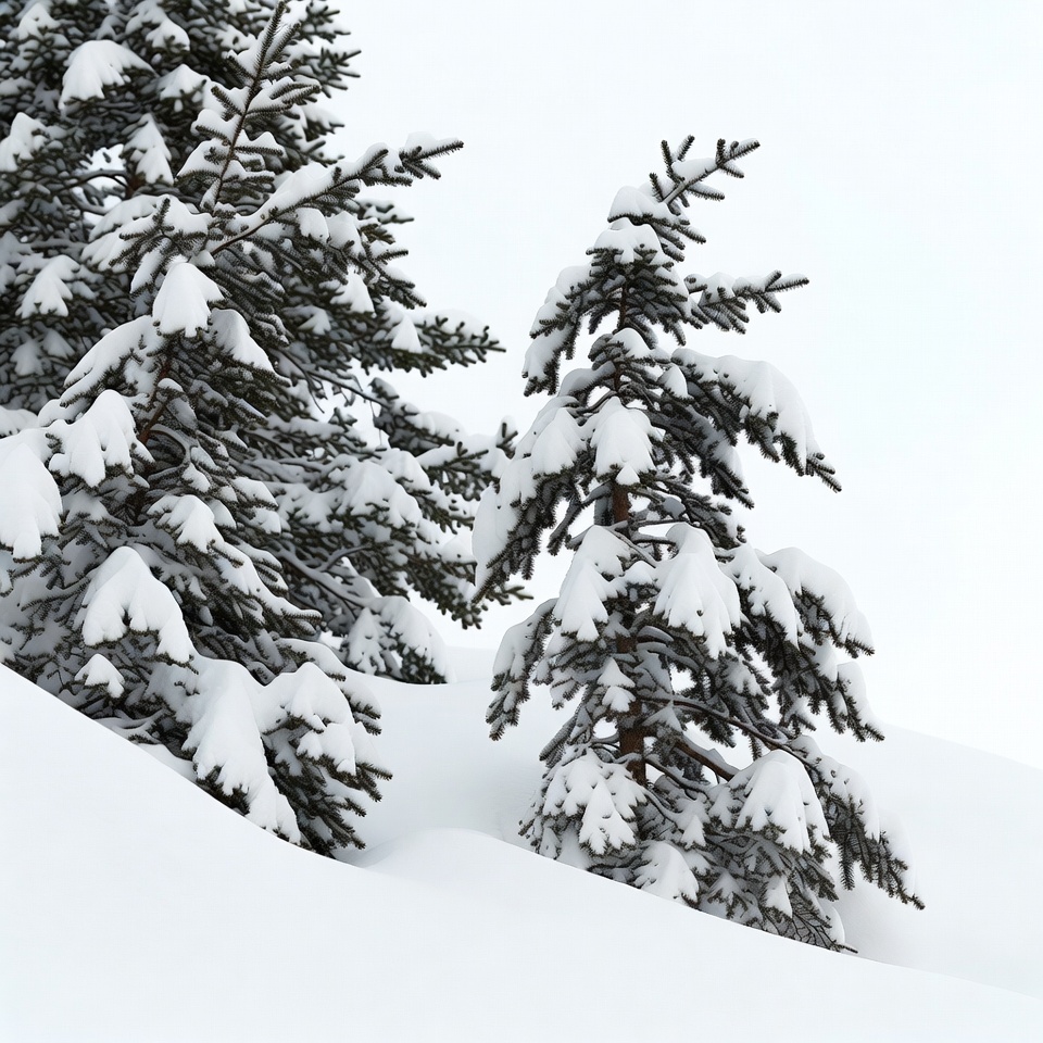 Several pine trees heavy with fresh snow stand against a snowy hillside. Their dark green branches are laden with white snow, contrasting sharply with the bright white snow-covered ground. The scene captures a serene winter landscape with evergreen trees.