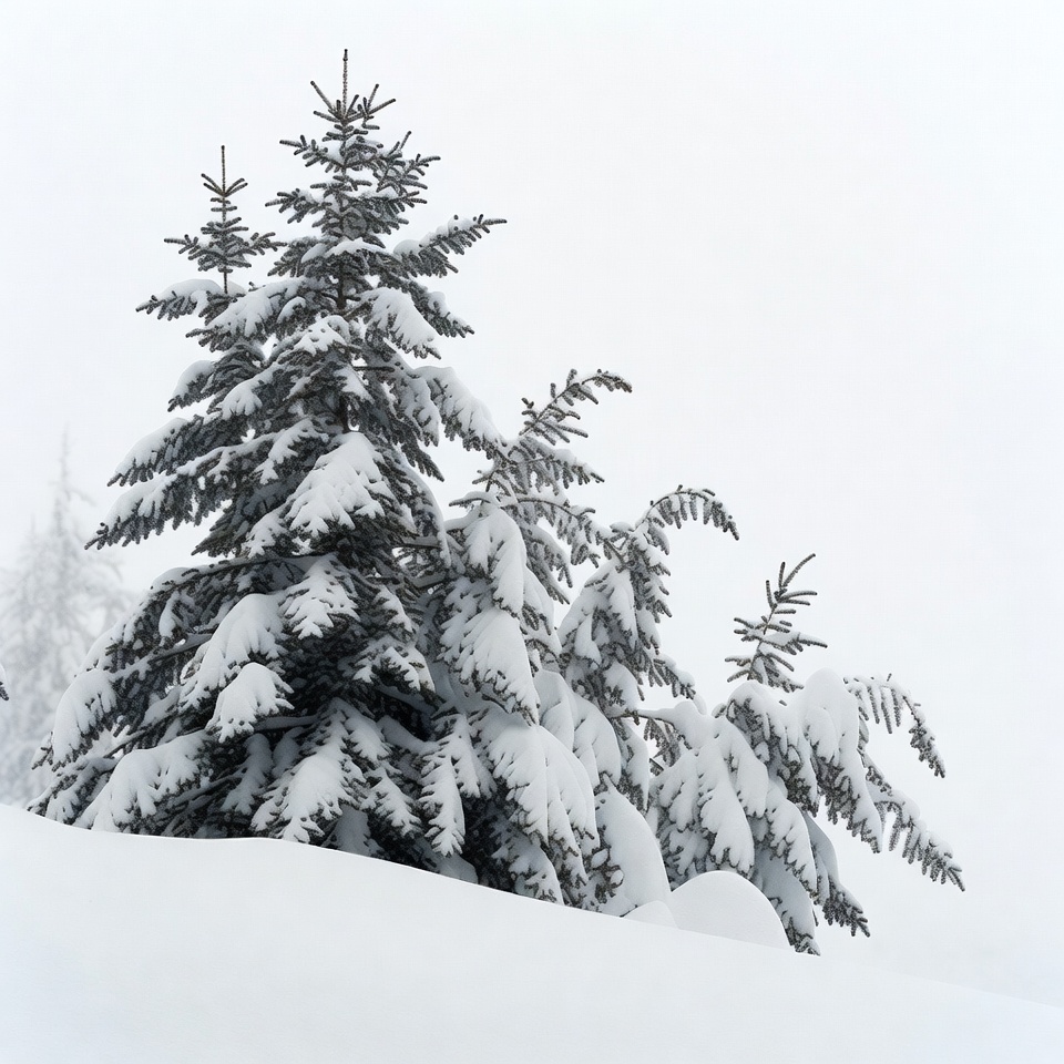 Several tall pine trees stand covered in thick snow on a snowy hillside. The branches are heavily laden with white snow, creating a dense, fluffy appearance. A foggy white background emphasizes the isolation of the trees in the winter landscape.