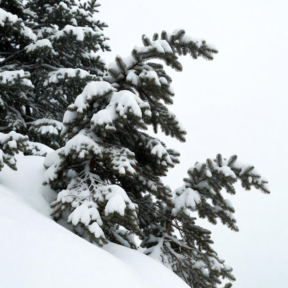alpine tree, cold weather, coniferous tree, evergreen tree, fir tree, forest tree, frosty tree, green needles, holiday tree, nature, outdoors, pine tree, snow covered, snow slope, snowy branches, spruce tree, white snow, winter landscape, winter tree, snowy pine tree