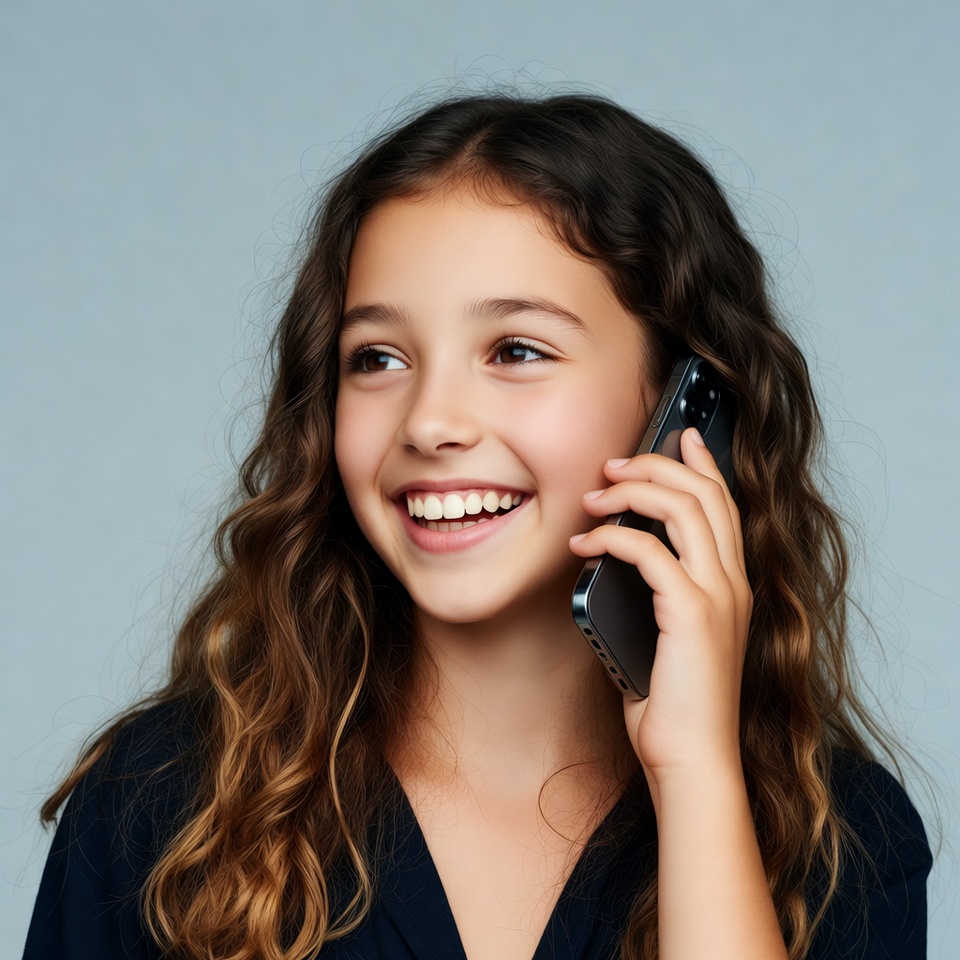 A young girl with long wavy brown hair smiles happily while talking on her iPhone. She wears a dark blue dress and looks slightly to the side against a plain light blue background. Her eyes are wide and expressive as she holds the phone to her ear.