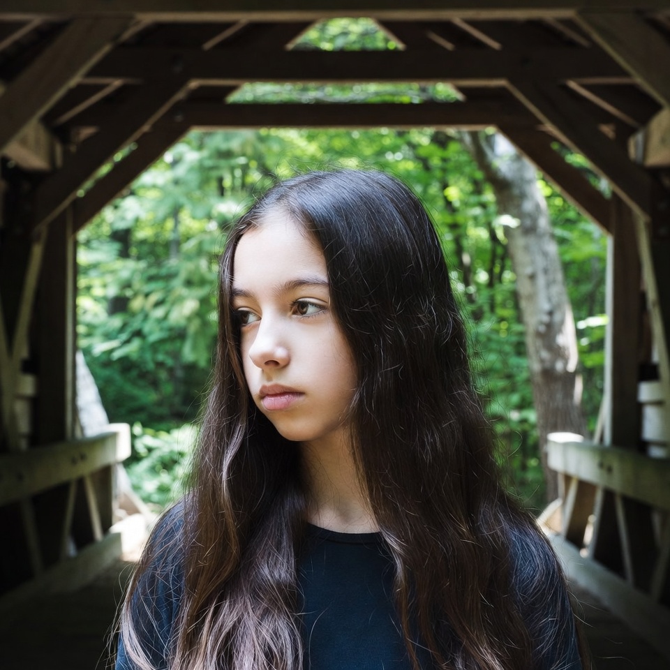 White, bridge interior, covered bridge, dark hair, dark shirt, female, forest, green trees, long hair, nature, outdoors, side profile, standing, sunlight, thoughtful expression, wavy hair, wooden bridge, woods, young girl, girl