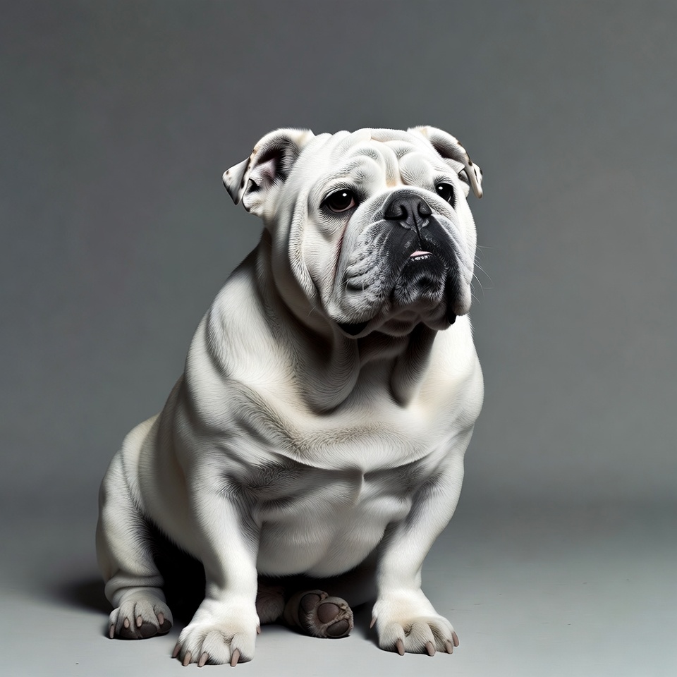 English bulldog, adorable dog, black nose, canine, dark eyes, dog, gray background, pet, puppy, purebred dog, short legs, sitting dog, white bulldog, wrinkled face, bulldog