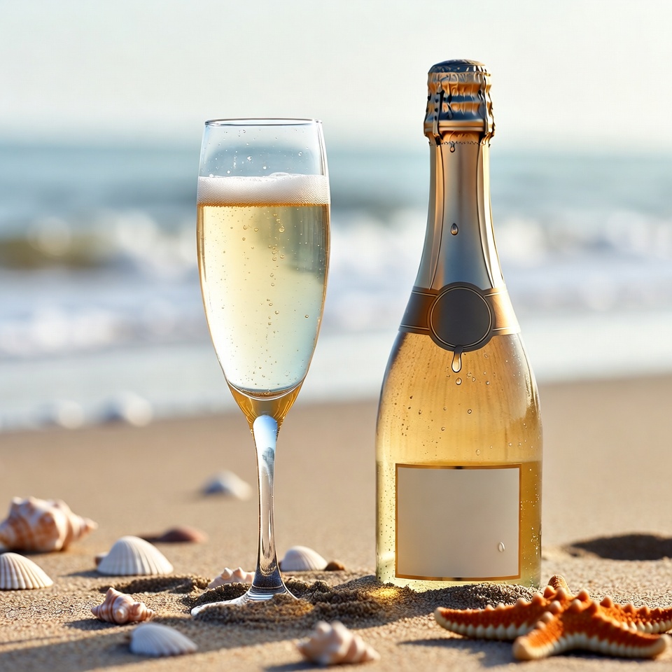 A tall glass of sparkling champagne stands next to an open bottle on sandy beach. Golden sunlight illuminates the fizzing bubbles in the glass and droplets on the bottle. Scattered seashells and a starfish surround them against a blurred ocean backdrop.