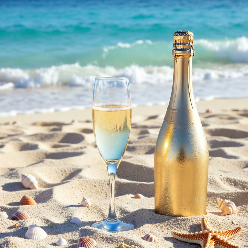 beach, celebration, champagne flute, champagne glass, gold bottle, isolated background, luxury, ocean waves, sandy beach, seashells, sparkling champagne, starfish, summer, tropical beach, turquoise water, vacation, champagne bottle