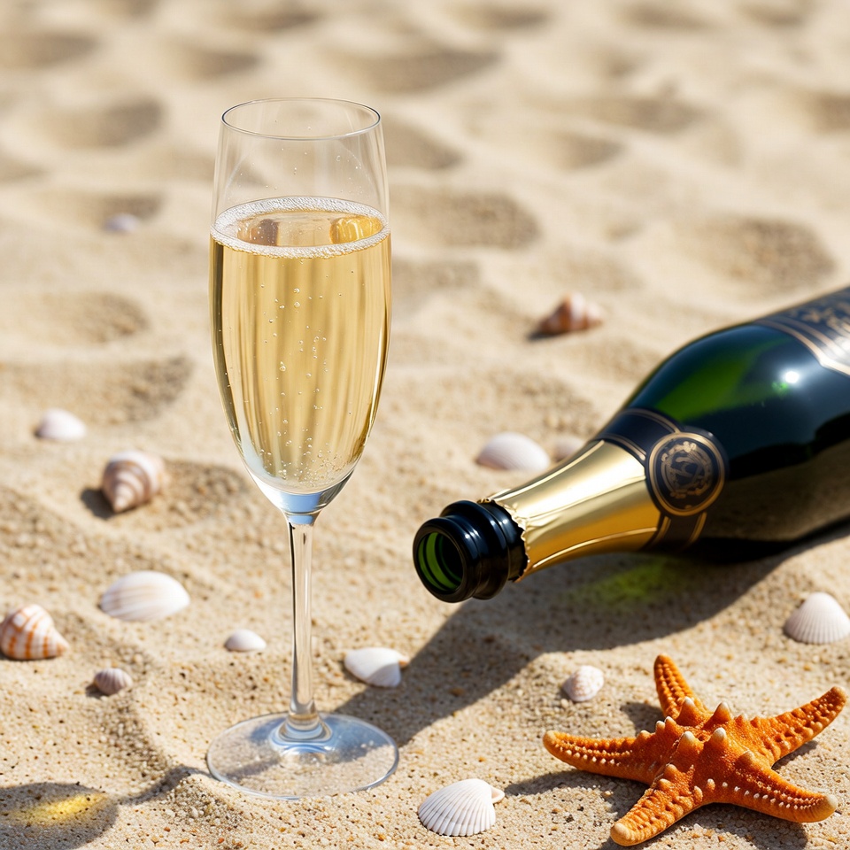 A tall glass of sparkling champagne stands on sandy beach with bubbles rising in the golden liquid. An open green bottle of champagne lies beside it, surrounded by scattered seashells and a bright orange starfish. The scene is set against a textured sand background with subtle shadows.