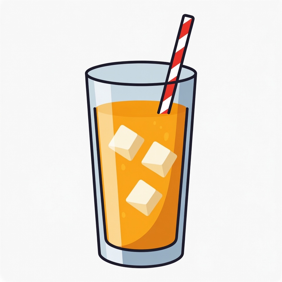 A clipart illustration shows a clear glass filled with orange juice and ice cubes. A red and white striped straw sticks out from the top. The glass is centered on a white background.
