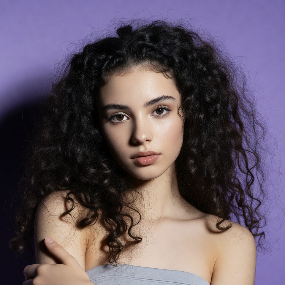Middle Eastern, arms crossed, beautiful, black hair, curly hair, female, gray top, headshot, long hair, natural makeup, portrait, purple background, strapless top, studio portrait, young woman, woman