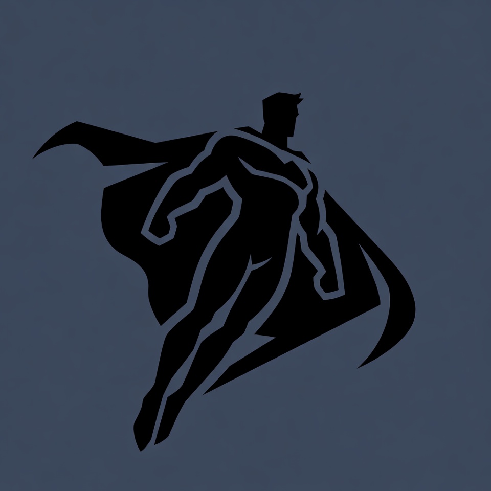 action figure, bold lines, cape, clipart, comic hero, dark blue background, dynamic pose, emblem, flight, flying, graphic design, hero, iconic superhero, illustration, isolated background, male, man, muscular, outline, powerful, silhouette, soaring, superhero, symbol, vector art, Superman