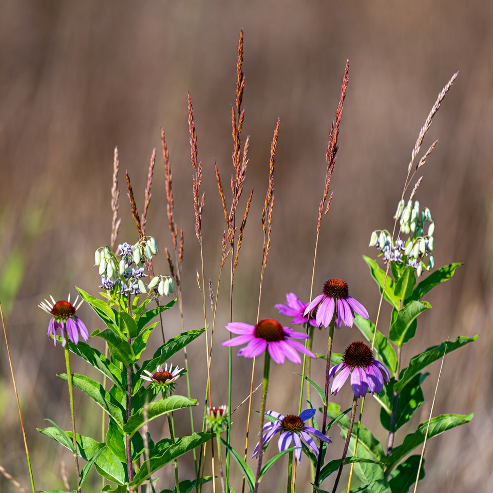 blurred background, brown centers, brown grass, echinacea, field, flower cluster, grasses, green leaves, nature, outdoor, petals, pink flowers, plants, prairie plants, purple flowers, summer flowers, tall grass, white flowers, wildflowers, coneflower
