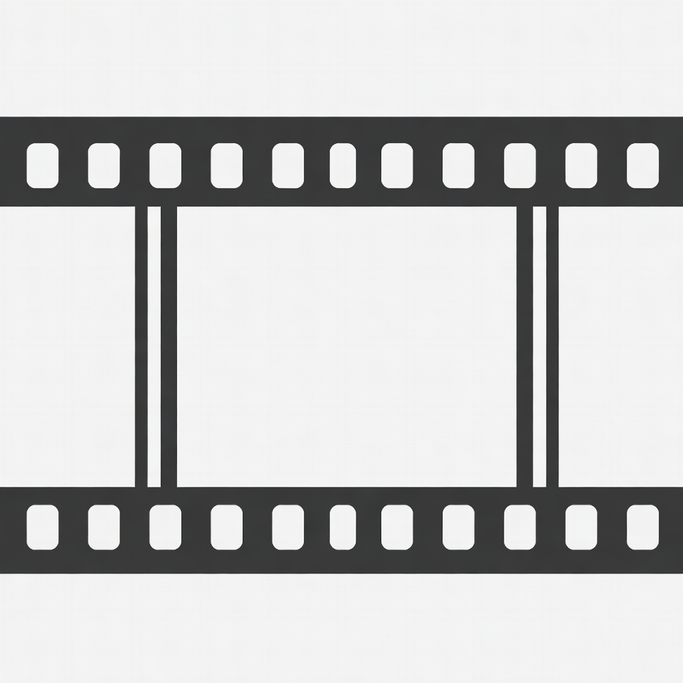 A simple black line art illustration of a 35mm film strip with multiple empty frames. The strip features perforated edges and two vertical divisions in the central frame area. It is isolated on a white background.