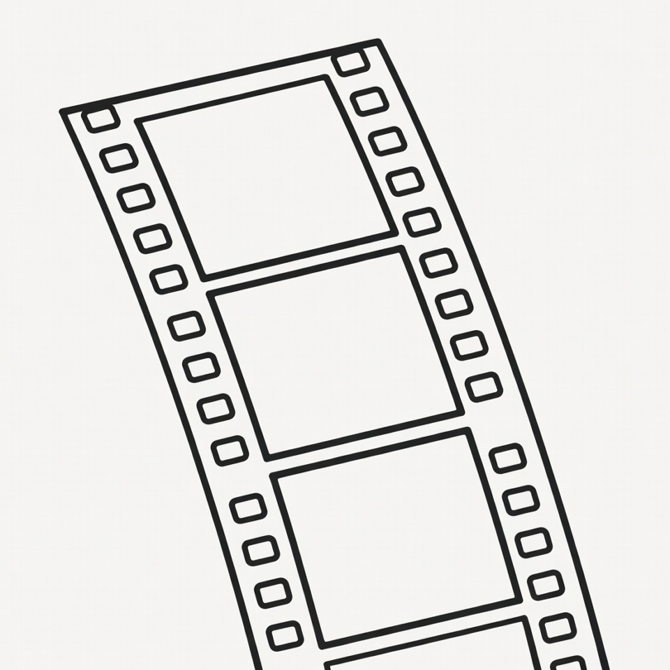 A black line drawing of a 35mm film strip is tilted on a white background. It features multiple empty rectangular frames with perforations along the edges. The illustration is simple and isolated.
