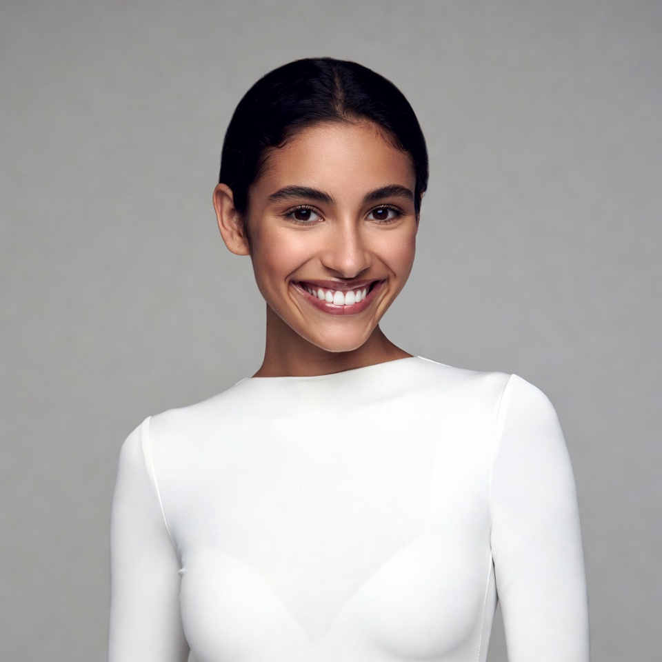 Multiracial, beautiful smile, boat neck, close-up face, dark hair, elegant, fashion, female, gray background, happy expression, headshot, long sleeves, mixed race, ponytail, portrait, smiling, studio portrait, white dress, young woman, woman