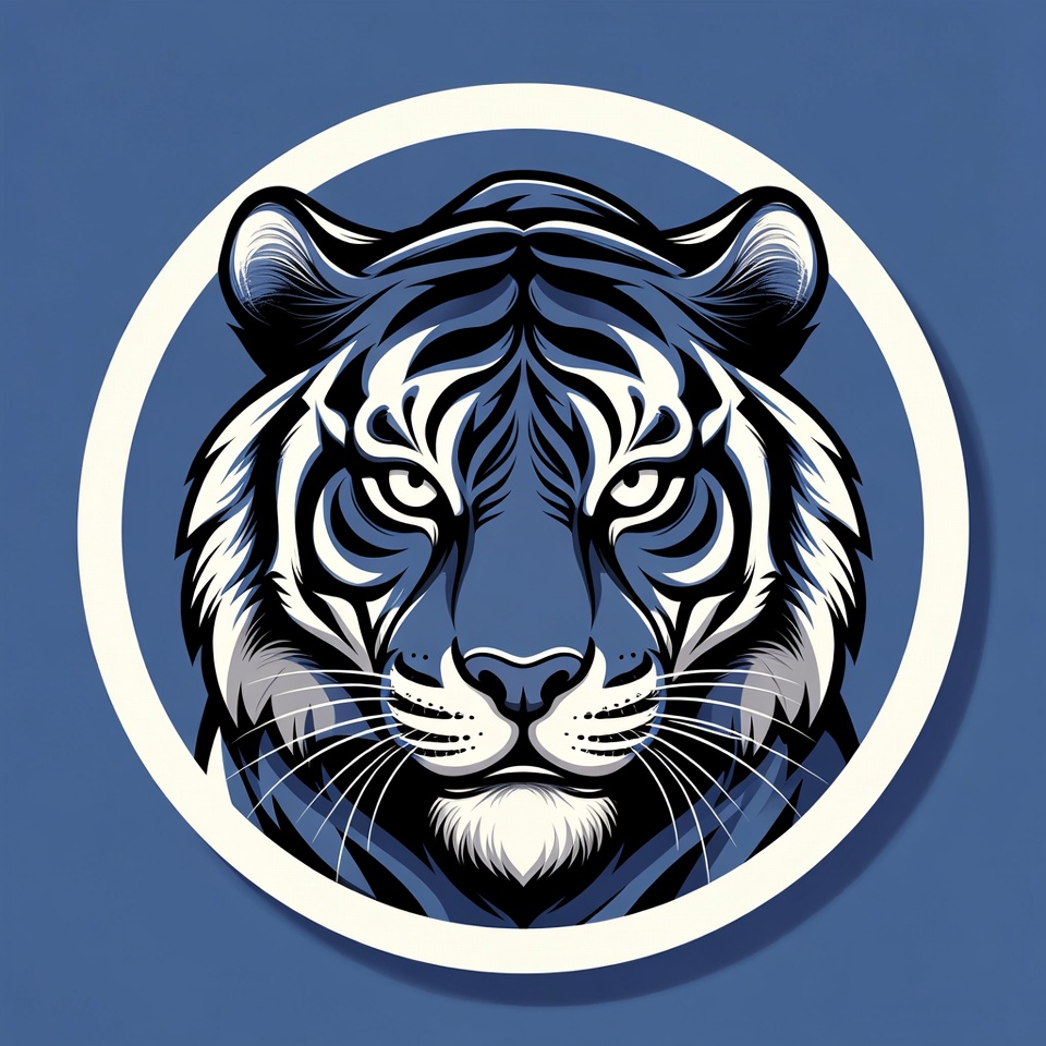 animal, blue tiger, circular, clipart, eyes, fierce tiger, graphic design, illustration, isolated background, logo, mascot, navy blue, predator, sticker, stripes, tiger head, vector art, whiskers, white outline, wildlife, tiger