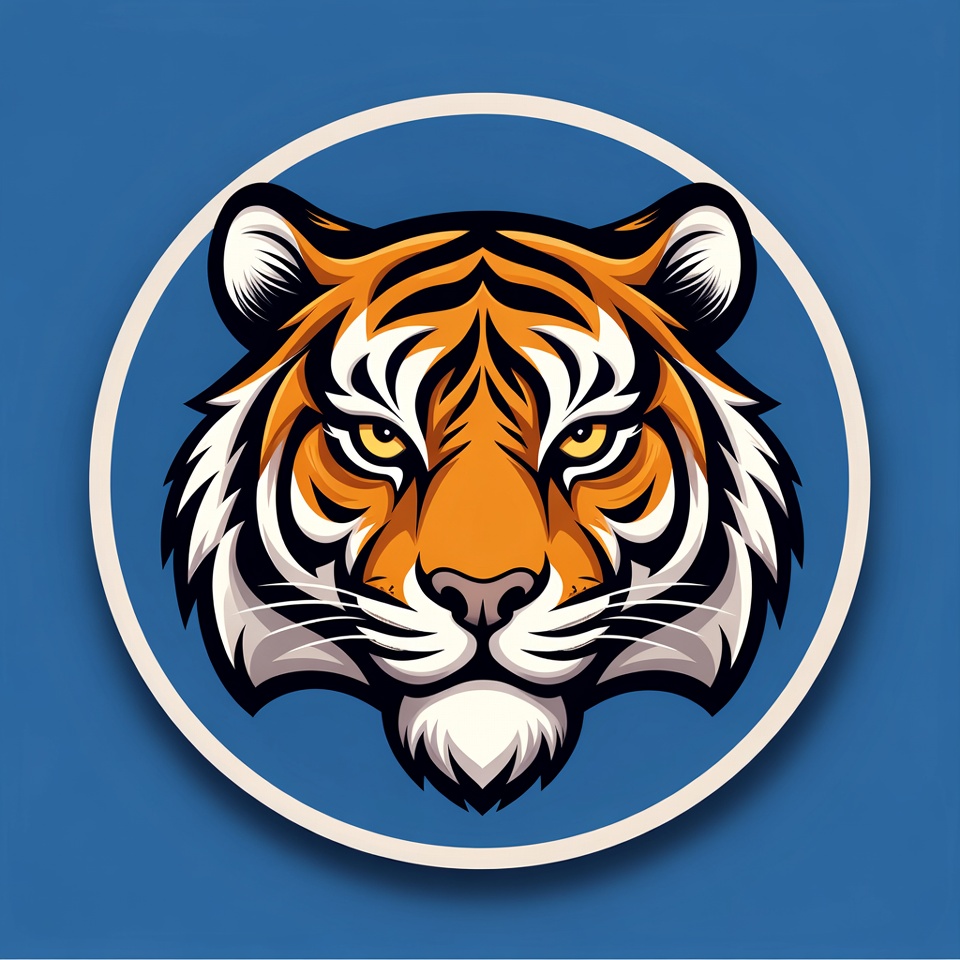 animal head, black stripes, blue background, cartoon tiger, clipart, emblem, fierce tiger, graphic design, illustration, isolated background, mascot, orange tiger, roaring tiger, tiger face, tiger head, tiger illustration, vector art, white circle, wild animal, tiger