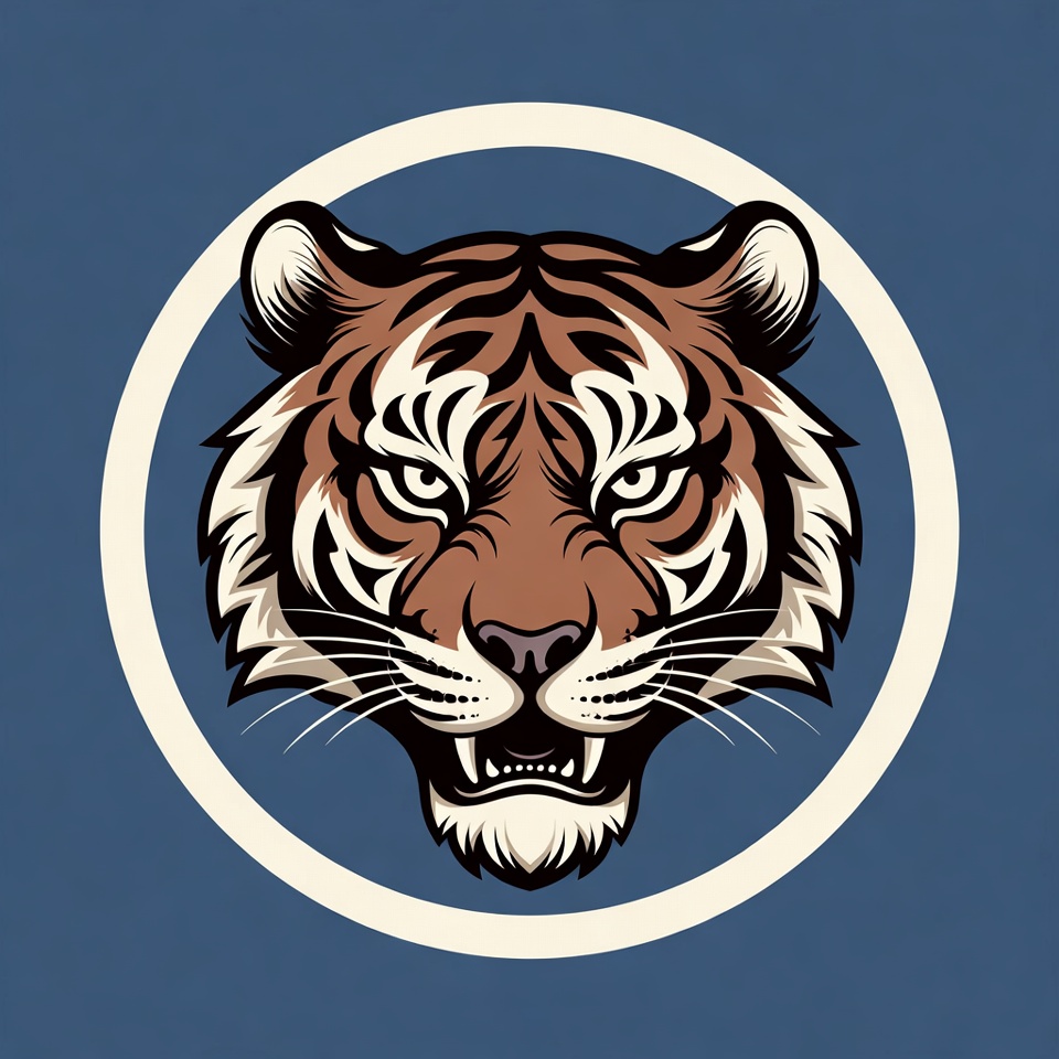 A detailed vector illustration of a fierce tiger's face with intense eyes and bared teeth. The tiger features bold orange and black stripes, white accents on the muzzle and ears, surrounded by a white circular outline. The background is solid dark blue.