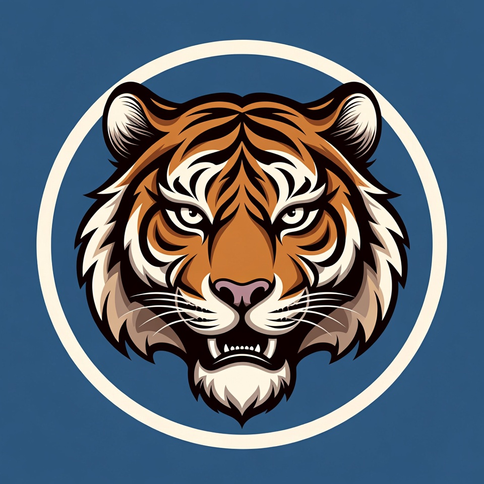 animal, bared teeth, black stripes, blue background, clipart, emblem, fierce tiger, graphic design, illustration, isolated background, mascot, orange tiger, roaring tiger, snarling tiger, tiger eyes, tiger face, tiger head, vector art, whiskers, white circle, wild animal, tiger