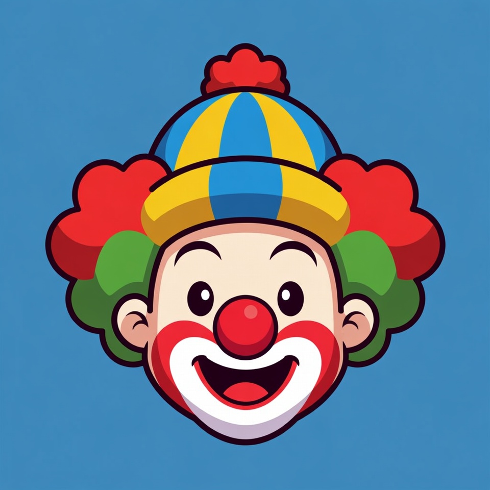 A colorful cartoon clown with a large red nose smiles widely on a solid blue background. The clown wears a blue and yellow hat with a red pom-pom and has green hair on the sides with red hair on top. Its face features big eyes, rosy cheeks, and white makeup around the mouth.