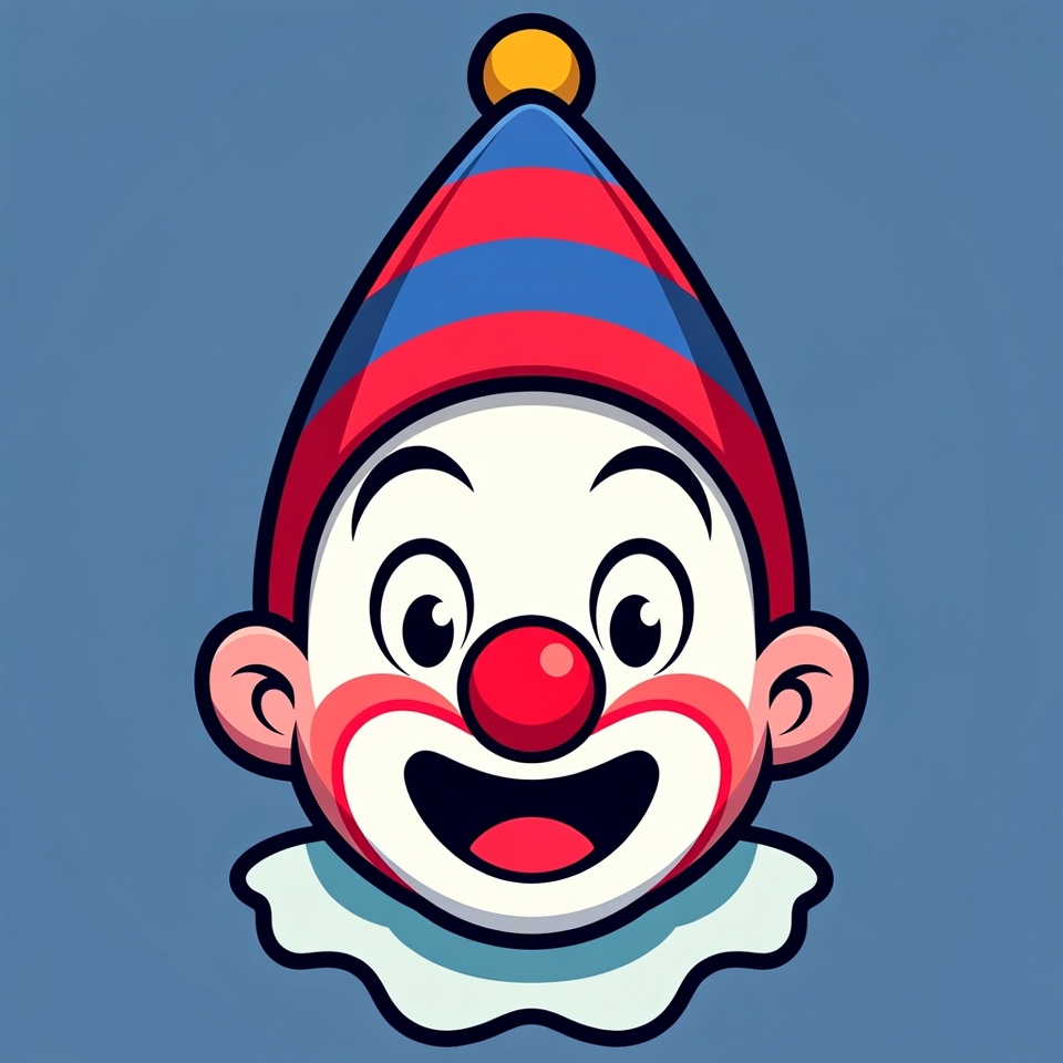 A vibrant cartoon illustration of a clown's face features a tall red and blue striped hat with a yellow pom-pom. The clown has white face paint, rosy cheeks, a large red nose, and big expressive eyes. It smiles widely with an open mouth and wears a white ruffled collar on a blue background.