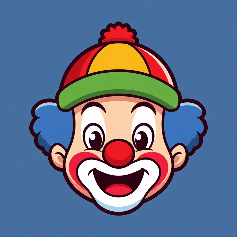 A vibrant cartoon clown with a large red nose and blue hair tufts grins widely on a solid blue background. He wears a colorful hat featuring red, yellow, green, and white sections. His face has exaggerated white makeup, rosy cheeks, and big expressive eyes.