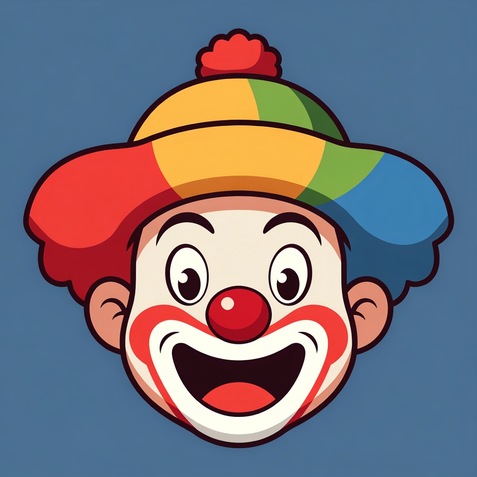A vibrant cartoon illustration of a clown's face on a blue background. The clown has white face paint, a large red nose, bushy red hair, and an oversized multicolored hat in yellow, green, and blue. He smiles widely with an open mouth and big expressive eyes.