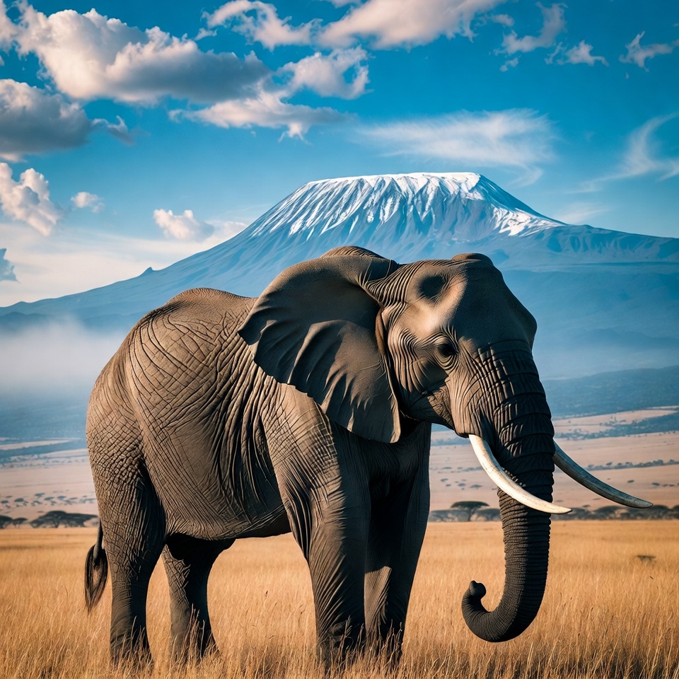 Africa, African elephant, Mount Kilimanjaro, animal, blue sky, clouds, golden grass, grass, isolated background, mountain, nature, outdoors, safari, savanna, snow-capped mountain, trunk, tusks, wildlife, elephant