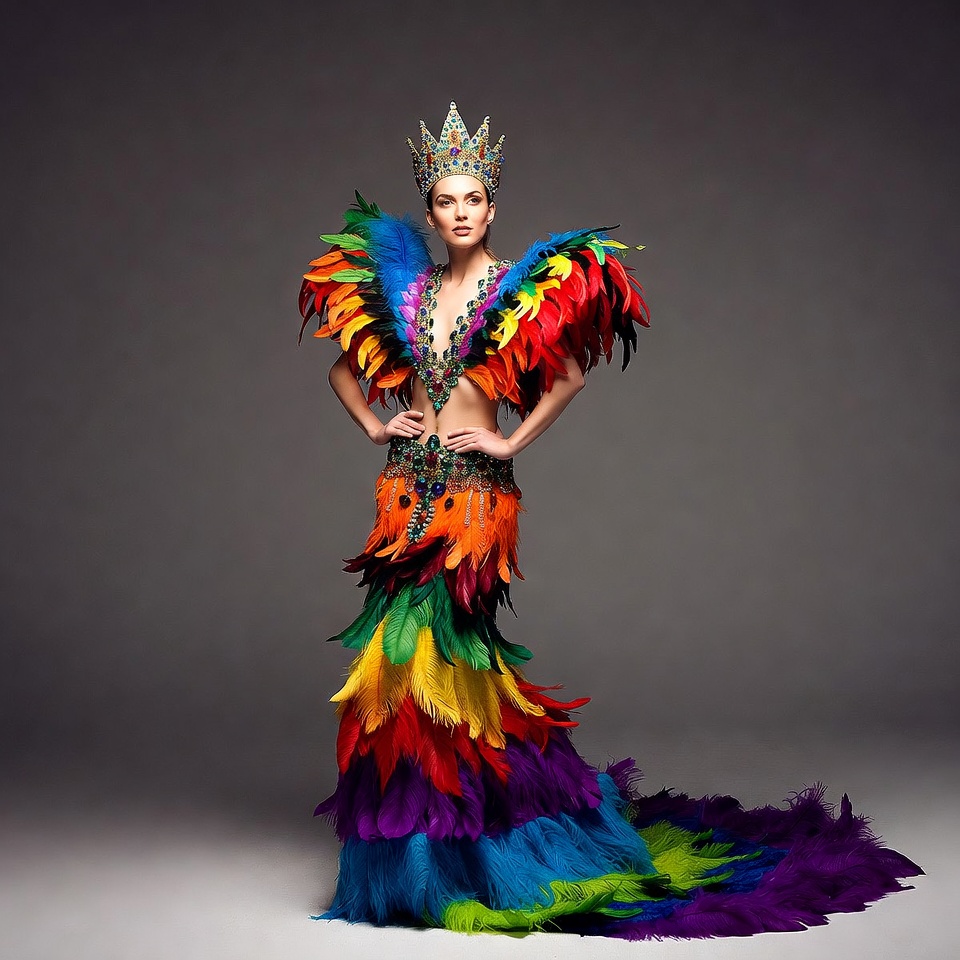 A woman with a jeweled crown stands confidently in an elaborate multicolored feathered gown on a dark background. The costume features vibrant feathers in red, blue, green, purple, and yellow, with a beaded necklace and hands on hips. She poses dramatically in the full-length dress with a flowing train.