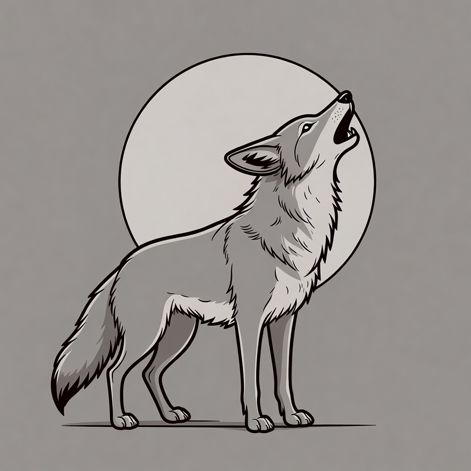animal, canine, clipart, desert coyote, full moon, furry tail, grayscale, howling, howling animal, illustration, isolated background, line art, moon, night, pointed ears, standing, vector, wildlife, wolf, coyote