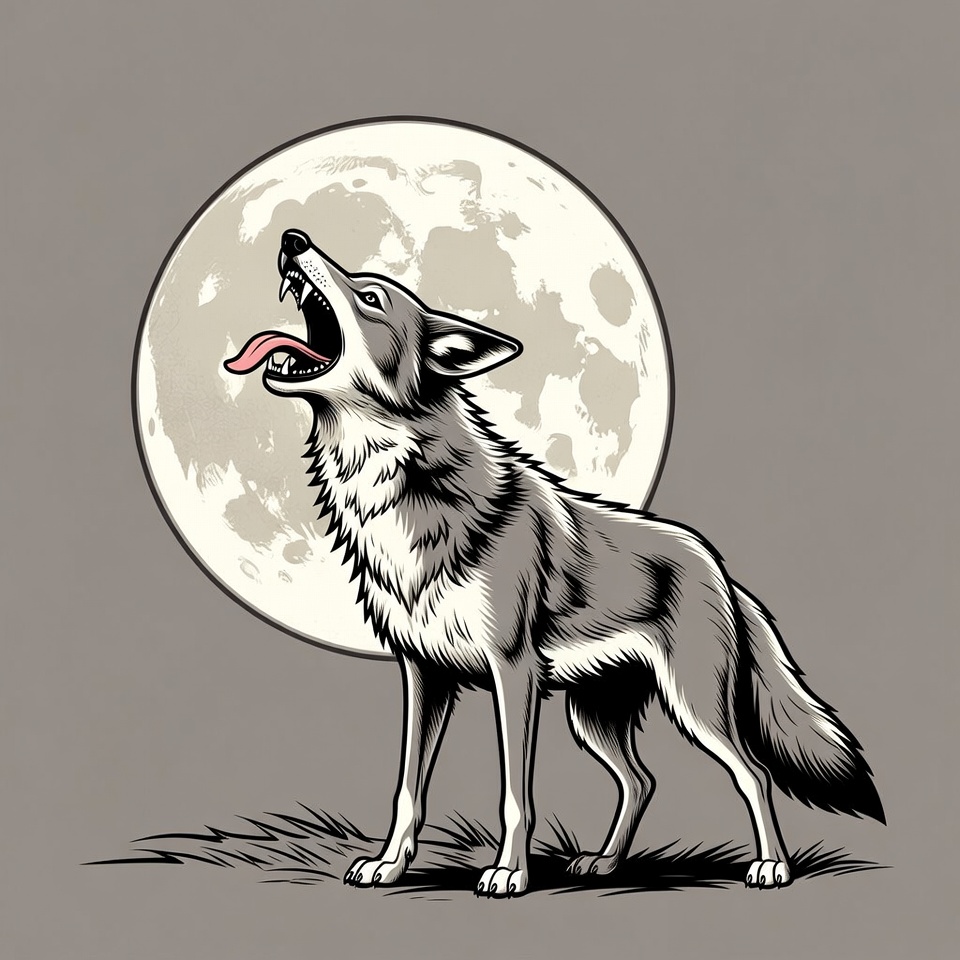 animal, canine, clipart, coyote, engraving style, full moon, grass, howling wolf, illustration, isolated background, line art, mammal, moon, night, vector art, wildlife, wolf howling, wolf