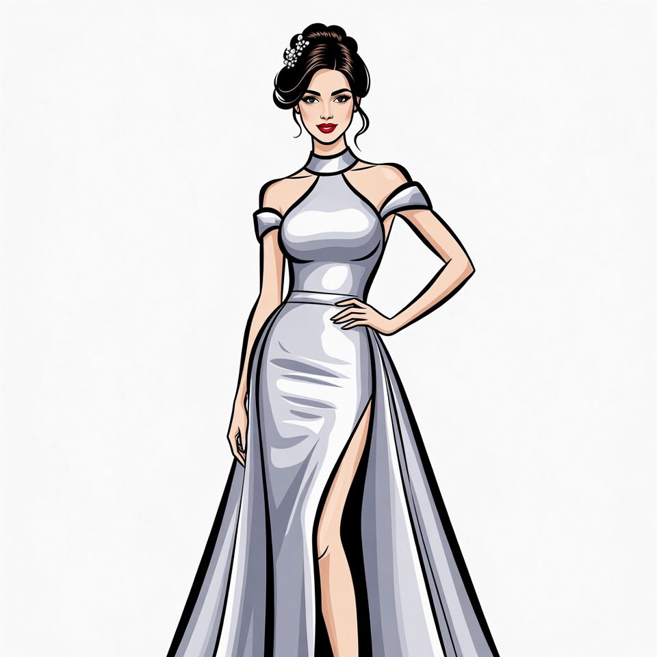 A stylish woman with dark hair in an updo wears a shiny silver off-shoulder gown with a high neckline and long slit. She stands confidently with one hand on her hip, posing on a white isolated background. The illustration features vibrant pop art style with detailed hair accessory and elegant dress design.