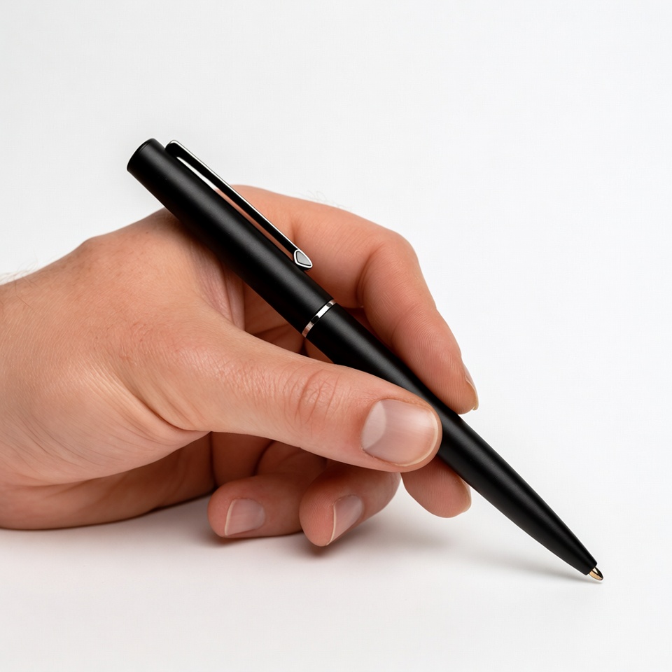 A hand grips a sleek black ballpoint pen with a silver clip and tip. The pen is held firmly between the thumb and fingers against a plain white background. The hand shows natural skin tones and subtle details.